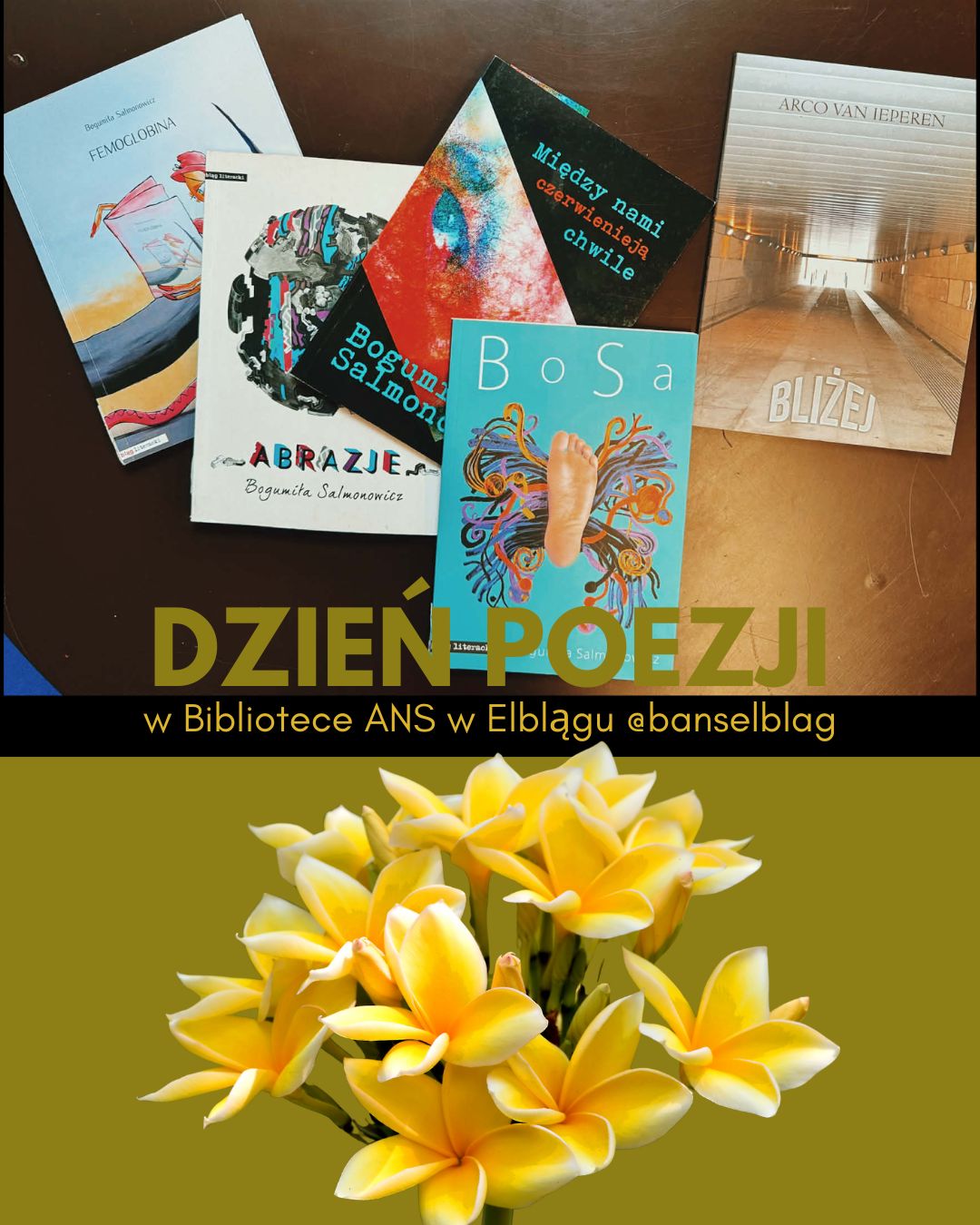 Z okazji Światowego Dnia Poezji, przypadającego 21 marca, Biblioteka ANS w Elblągu zaprasza do czytania, przeglądania i odkrywania twórczości poetyckiej naszych wykładowców – Bogumiły Salmonowicz oraz Arco van Ieperena. Oboje są wykładowcami Instytutu Pedagogiczno‑Językowego ANS w Elblągu, a ich tomiki poetyckie dostępne są dla czytelników na miejscu, w naszej czytelni.