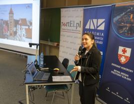 Następnie mieliśmy okazję obejrzeć film dotyczący Elbląga, po którym Sylwia Bożyk - Pełnomocnik Prezydenta Elbląga ds. Dzieci i Młodzieży, poprowadziła interaktywną prezentację, angażując uczestników do odpowiadania na pytania i rozmowy o naszym mieście.