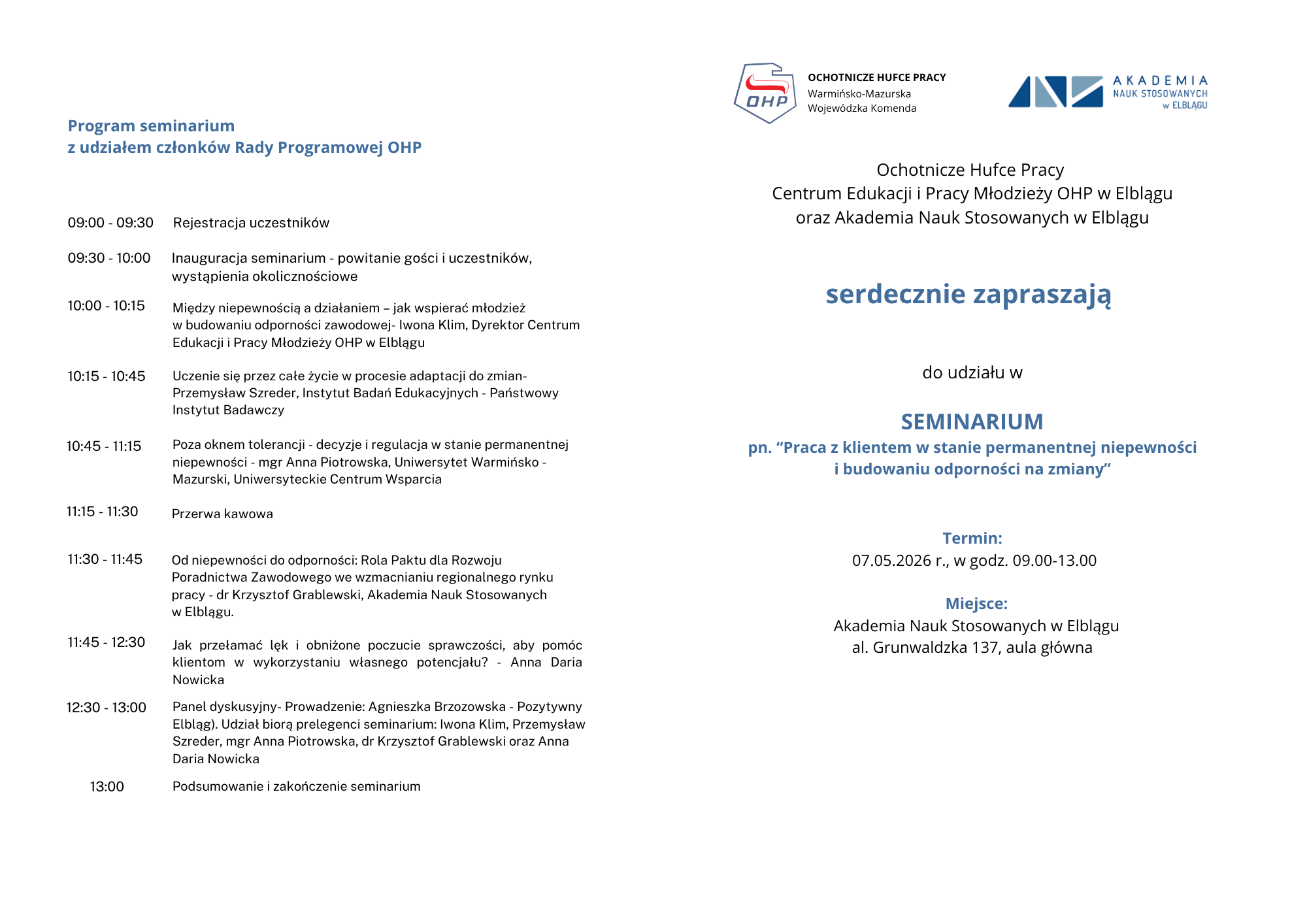 Akademickie Biuro Karier ANS w Elblągu oraz Centrum Edukacji i Pracy Młodzieży OHP serdecznie zapraszają całą społeczność studencką na seminarium: „Praca z klientem w stanie permanentnej niepewności i budowanie odporności na zmiany”