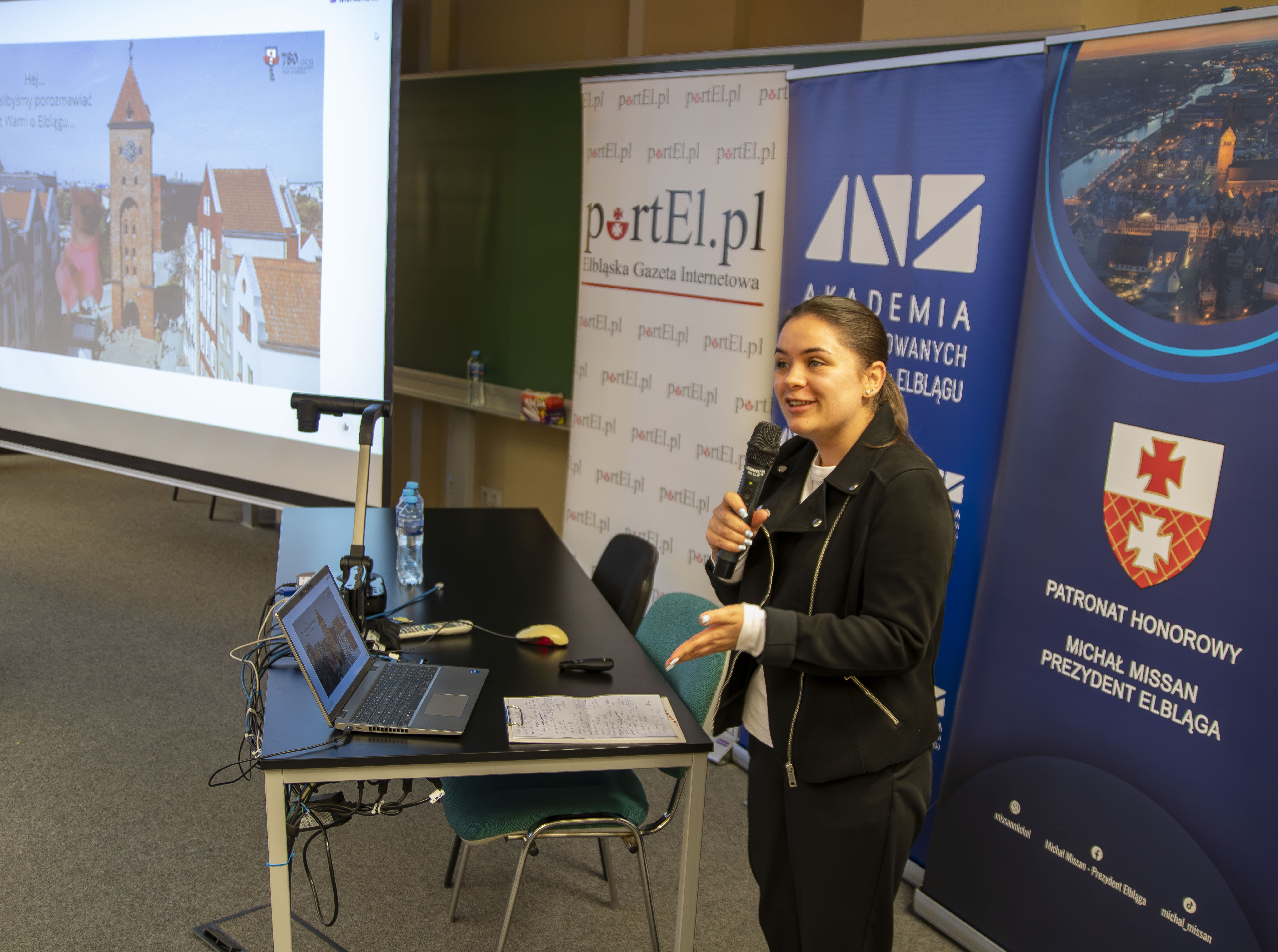 Następnie mieliśmy okazję obejrzeć film dotyczący Elbląga, po którym Sylwia Bożyk - Pełnomocnik Prezydenta Elbląga ds. Dzieci i Młodzieży, poprowadziła interaktywną prezentację, angażując uczestników do odpowiadania na pytania i rozmowy o naszym mieście.
