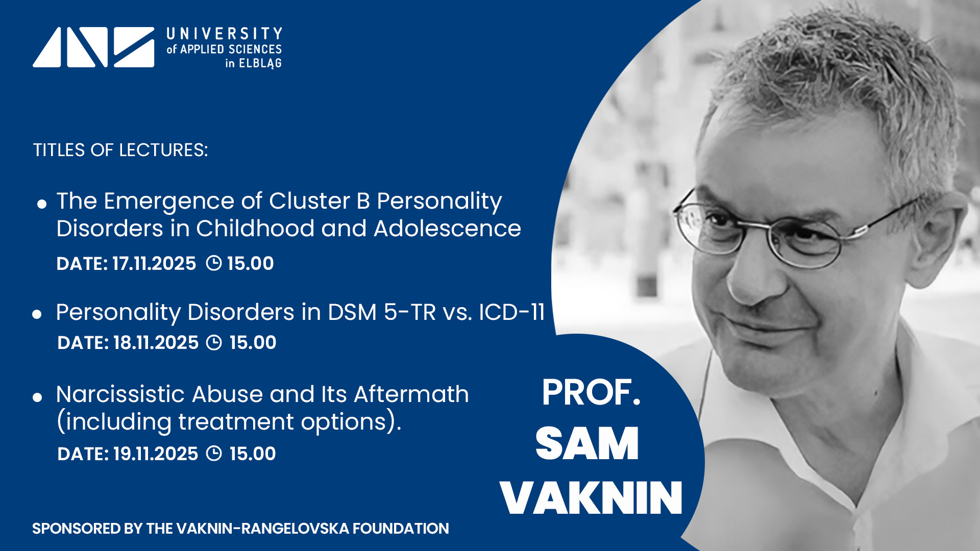 z przyjemnością zapraszamy na cykl trzech otwartych wykładów online prowadzonych przez prof. Sama Vaknina, które odbędą się w dniach 17–19 listopada 2025 roku w Instytucie Pedagogiczno-Językowym ANS w Elblągu.
