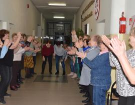W drugiej części spotkania mgr Lidia Kęska przeprowadziła warsztaty zatytułowane „Muzyczno-ruchowe recepty na zdrowie”. Była to kontynuacja zajęć prowadzonych w ubiegłym roku akademickim. Uczestniczki nie tylko mają okazję do aktywności ruchowej w rytm dobranych utworów, ale przede wszystkim doświadczyć wielu pozytywnych emocji, bo śmiech jest nieodłącznym elementem tych zajęć.