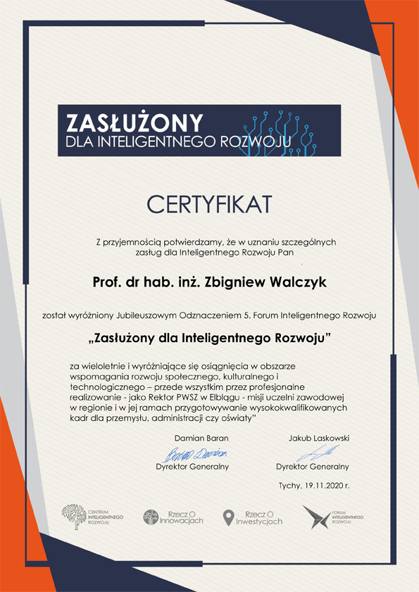 Z przyjemnością informujemy, że w uznaniu szczególnych zasług dla Inteligentnego Rozwoju prof. dr hab. inż. Zbigniew Walczyk został wyróżniony Jubileuszowym Odznaczeniem 5. Forum Inteligentnego Rozwoju „Zasłużony dla Inteligentnego Rozwoju” za wieloletnie i wyróżniające się osiągnięcia w obszarze wspomagania rozwoju społecznego, kulturalnego i technologicznego – przede wszystkim przez profesjonalne realizowanie jako Rektor PWSZ w Elblągu - misji uczelni zawodowej w regionie i w jej ramach przygotowywanie wysokokwalifikowanych kadr dla przemysłu, administracji czy oświaty.